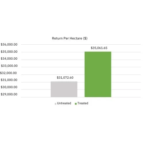 Harvest was conducted in 2019. The results for the treated and untreated areas were provided by the farm’s management team. The gross margin analysis was then coducted by Bioptiv to quantify the economic value/benefit to the business.
