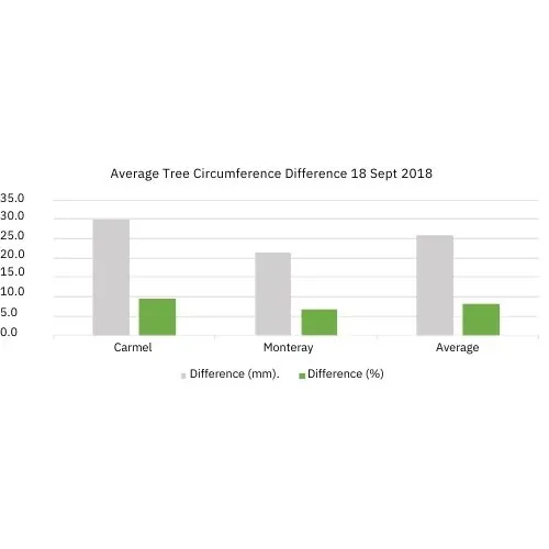 Only tree circumferences were measured due to ongoing tree pruning management processes. Measurements were recorded in September 2018 and February 2019.